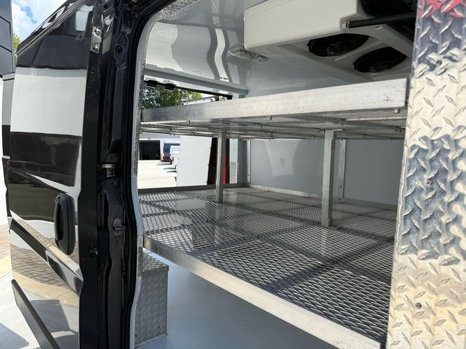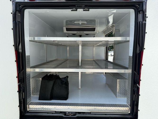Insulated box with Thermo King V320 cooling system. Metal shelving for flexibility and proper airflow to keep things cool!